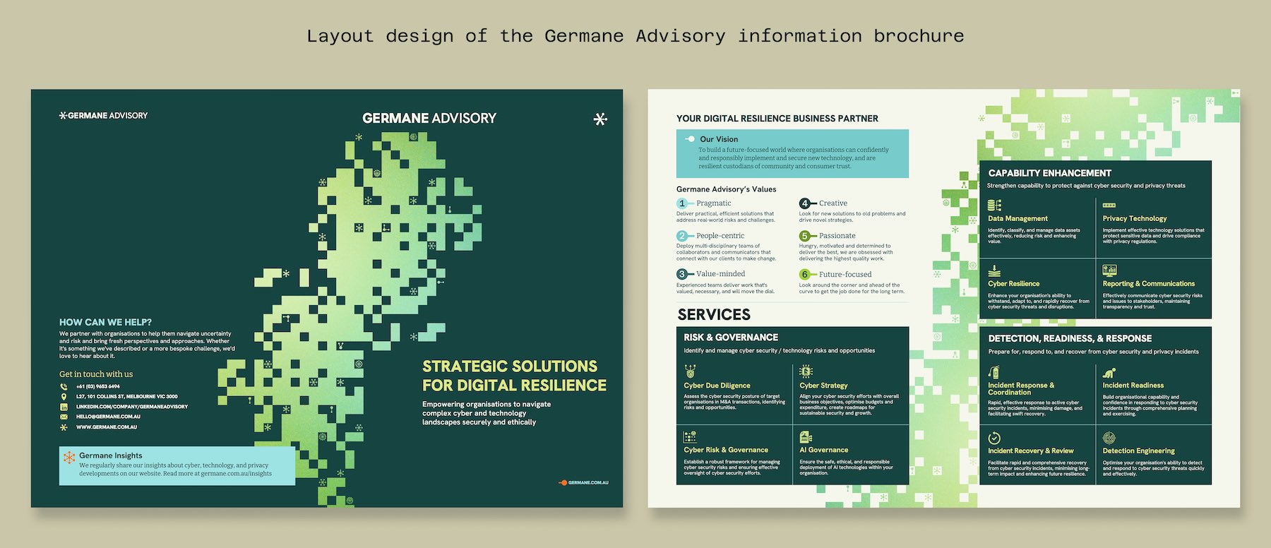 Not all of Germane Advisory’s clients are IT specialists. They can be board members or executives at large companies. The brand identity needed to connect with them through accessible communication and calm confidence, but also point to the strong technical capability that underpins many of Germane’s services.